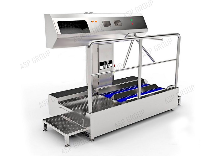 Модуль контроля выхода. Необходимо последовательное выполнение действий по дезинфекции рук и обуви для разблокировки турникета для входа. Турникет блокирует выход из производственной зоны.