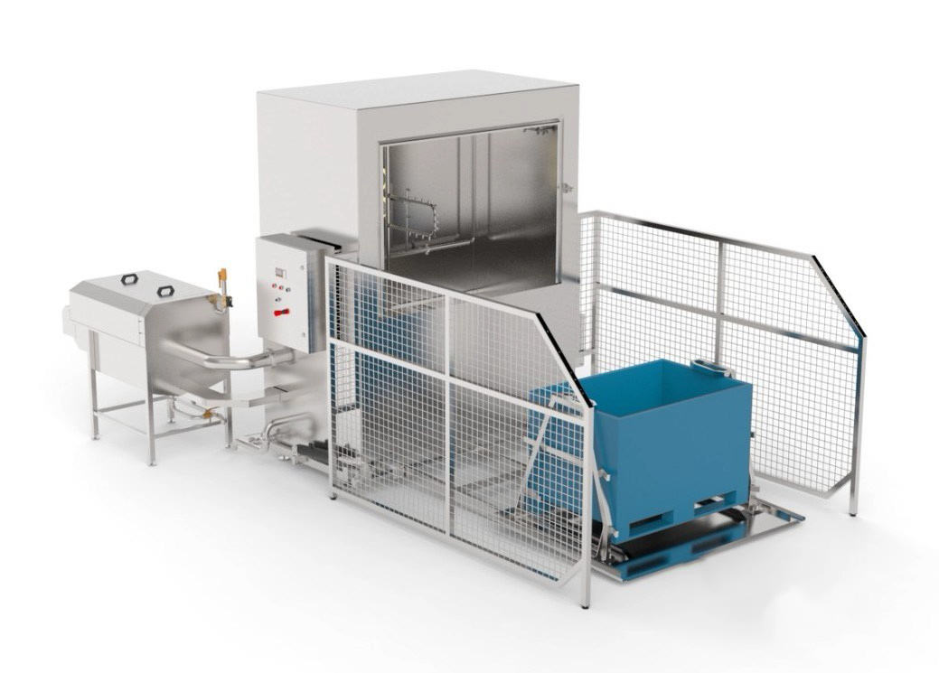 После нажатия кнопки старт, в ванну/резервуар поступает вода, при наполнении до датчика верхнего уровня, которые не реагирует на пену, включаются ТЭНы или при помощи пара происходит нагрев до указанной температуры. При помощи перистальтического насоса в ванну дозированно подается необходимый моющий раствор. Из-за разницы плотности и температур – происходит перемешивание раствора до однородного состояния. Приготовление раствора окончено, машина готова к мойке тары. Для загрузки тары необходимо открыть дверь, открывается она вниз. Чан-тележку или биг-бокс закрепить на захватах, при нажатии кнопки пуск дверь с установленной тарой закрывается. При закрытии тара размещена так, что форсунка для мойки внутренней части расположен внутри тары. По внутреннему периметру машины расположены форсунки, которые омывают внешнюю часть тележки и колеса. Машины для мойки чан-тележек используются в мясоперерабатывающей, рыбной, молочной и овощной индустрии. Оборудование изготавливают из нержавеющей стали.
