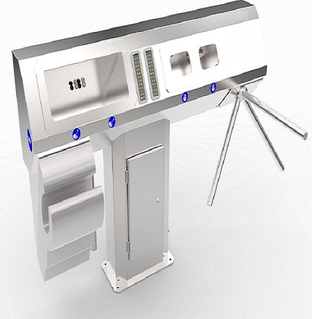Станция гигиены рук/Санпропускник ASP-H-04 предназначен для мойки и дезинфекции рук персонала перед входом в санитарную зону. Состоит из модуля мойки рук, модуля дезинфекции рук и модуля контроля входа. Модуль мойки рук. Моющее средство подается автоматически при срабатывании фотоэлемента, расположенном в камере мойки рук, после чего подается вода для смыва раствора. Модуль дезинфекции рук. Дезинфицирующее средство подается автоматически при поднесении рук в зону фотоэлемента при помощи электронасоса через 4 форсунки (две сверху и две снизу, для сокращения времени обработки). Модуль контроля входа. Необходимо последовательное выполнение действий по дезинфекции рук и обуви, после чего происходит разблокировка турникета для прохождения в производственную зону. Выход из производственной зоны турникет продолжает блокировать.